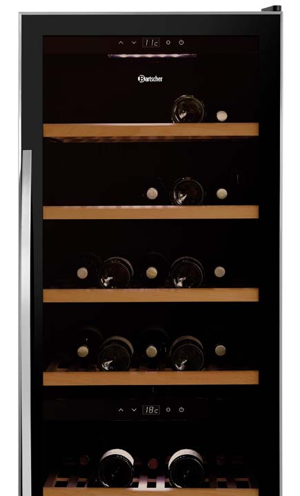 Bartscher Wijnkoelkast | Gecoat staal | 180 Flessen | 453 Liter | 2 Temperatuurzones | 8 planchetten | 600 x 750 x H 1.860 mm. | 0.15 kW | 230 V