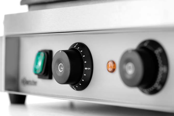 Bartscher Contact-grill “Panini-T” 1GR | RVS | Timer | Gietijzer/Geemailleerd | Boven Geribbeld 335×220 mm./Onder Glad 335×230 mm. | 50 C – 300 C | Reinigingsborstel | 2.2 kW | 230 V | 410 x 400 x H 200 mm.